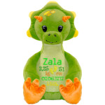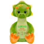 Prikupno navihan zeleni dinozaver je izjemno prijazen in crkljiv dinozaverček! Narejen je iz kratkega pliša zelene barve, z oranžnimi podplati in dvema rožičkoma na glavi. Na svojem trebuščku pa skrbno čuva prostor za vaš unikatni napis ali podatke o vašem novorojenčku.
