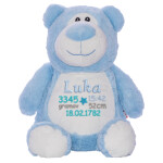 Klasičen pastelno modri medvedek je najpogostejše darilo za malega fantka. Mehak pliš je idealen za objeme in cartanje.