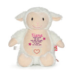 Nagajiva bela ovčka, veliosti 40 cm, je narejena iz daljšega pliša , ki ji daje puhast videz v svojem mehkobu. Na hrbtu skriva kratek repek , na trebuščku pa pazi na prostor za svoj unikaten napis.