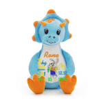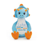 Prikupno navihan moder dinozaver je izjemno prijazen in crkljiv dinozaverček! Narejen je iz kratkega pliša modre barve, z oranžnimi podplati in dvema rožičkoma na glavi. Na svojem trebuščku pa skrbno čuva prostor za vaš unikatni napis ali podatke o vašem novorojenčku.
